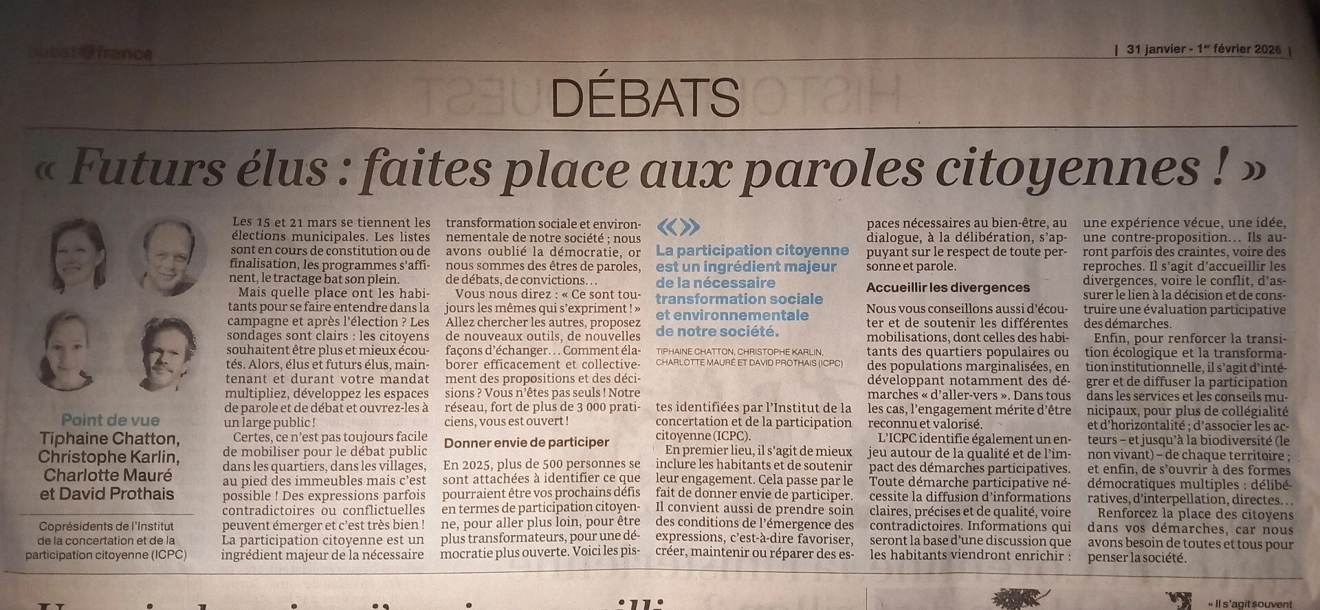 La participation au vote ne fait pas tout. Quelle place ont les habitants pour se faire entendre dans la campagne des élections municipales et après l’élection ? Quatre responsables de l’Institut de la concertation et de la participation citoyenne (ICPC) détaille leurs recommandations : à lire dans Ouest-France du 31 janvier.
